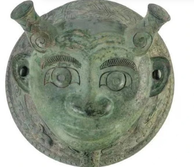 这件商代晚期的人面盉,整体为圆形,器腹外鼓,下垂,有流,敛口,盖作人面形,两耳有孔,头上有两个角,人面仰天朝上。器盖与器身连起来,如同一个仰卧的人头。器身显得较矮,在两旁近额处有两只兽面状贯耳,恰与人面双耳巧妙相对;器底圈足边镂三孔,一孔在流之下,其他两孔分别在盖耳和贯耳之下,可用系深以系绳提携。在腹部和器盖的两角之间,主要饰有商代常见的龙纹,圈足上则铸饰云雷纹。人面盉盖的后脑勺有一条蟠卷而下的龙体或蛇体,与盖子的人面连为一体,盉的颈部两侧可以看到两个龙爪,所以人面盉的整体造型应该是“人面龙身”或者“人面蛇身”。这件人面盉形制极为独特,风格奇谲怪异,尤其是夸张的人面,格外引人注目,体现出浓郁的神秘气息,为海内外所仅见。