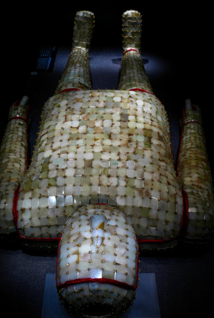 金缕玉衣,西汉,长170、最大宽78、足高26厘米,金缕是黄金的丝,玉衣是埋葬时覆盖死者身体的玉制服装。由于过去的盗墓者将黄金铁丝拔了出来,黄金铁丝被发现时已经支离破碎,近年才复原成原来的样子。该玉衣由4000多个具有透明感的玉片用金丝缝制而成。玉片经鉴定为新疆维吾尔自治区和田玉,均打磨精美。玉片经过精密加工以适应身体曲面,复杂的手部形状也巧妙地表现出来。眼睛、鼻子、嘴、胸部等都经过特别加工。