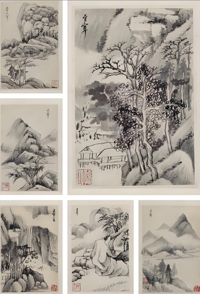 董其昌山水书画册包含十幅小品。每幅纵20.1厘米,横12.4厘米,融合了黄公望、王蒙等名家风格与个人笔墨创新。画册以行书笔意勾勒山石云树,展现传统技法多样探索,画面萧散淡逸,题跋直溯仿古渊源,充分体现了董其昌“拙中带秀”的艺术追求,是研究其绘画理论的重要实物资料。