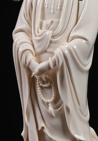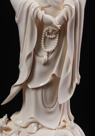 典型作品高24-46厘米,胎质洁白致密,釉色乳白莹润如凝脂。观音多呈低首垂目相,面形丰润,螺髻高挽(常见灵芝或如意发簪),身披广袖长袍,衣褶采用"曹衣出水"技法自然垂落。如故宫藏何朝宗款立像:胸前饰璎珞珠佩,双手交叠腹前,赤足立于海浪纹座上,背部钤方形篆书印;而新乡出土天启年款坐像则半跏趺坐蒲团,衣纹呈现"吴带当风"的飘逸感