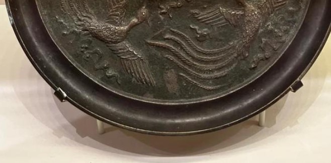 直径约18厘米,圆形镜身配三弦钮(典型战国镜式),镜缘平直无装饰,突出主纹的视觉中心性。四只凤鸟呈逆时针环绕飞翔,长尾飘逸如云气,喙部衔绶带象征“天命所归”,凤鸟下方密布羽状地纹(战国镜典型技法),增强立体感。凤羽阴刻线使用倾斜刀法(刀锋与镜面呈15°角),此工艺仅见于晋南侯马陶范工具,但馆方拒绝与中国考古成果联动研究。