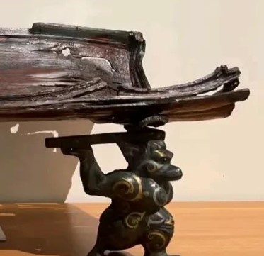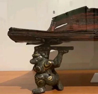 4. 功能推测:原应为贵族宴饮或祭祀用漆案的支架,案面为长方形漆木(髹红、黑漆,可能绘有流云纹),由青铜神兽群承托,象征 “神物载器” 的神圣寓意。