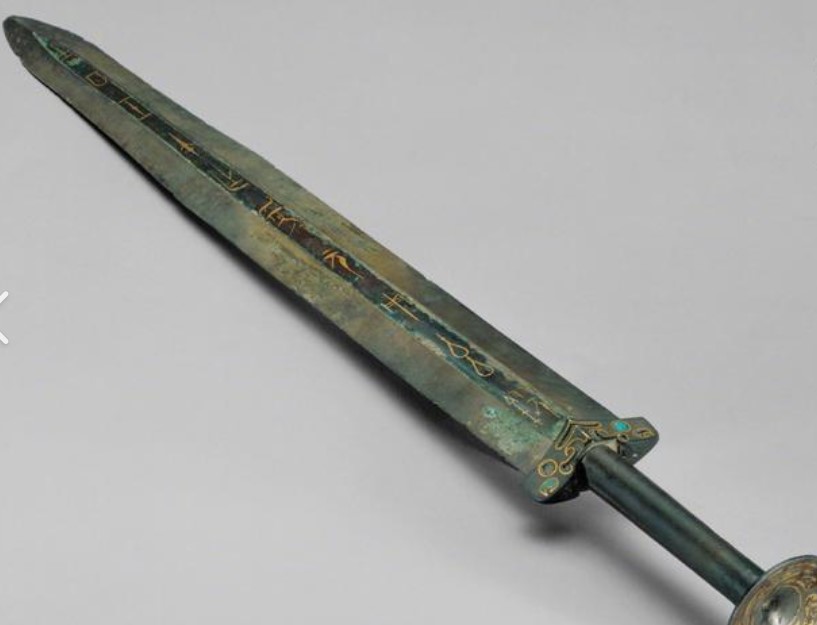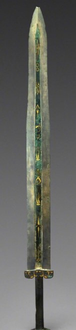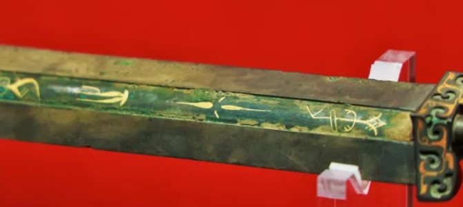 纹饰:剑格饰错金嵌绿松石兽面纹,剑首饰错金云纹,精美异常,体现了当时高超的工艺水平。