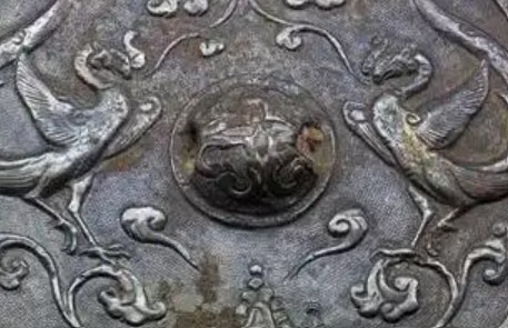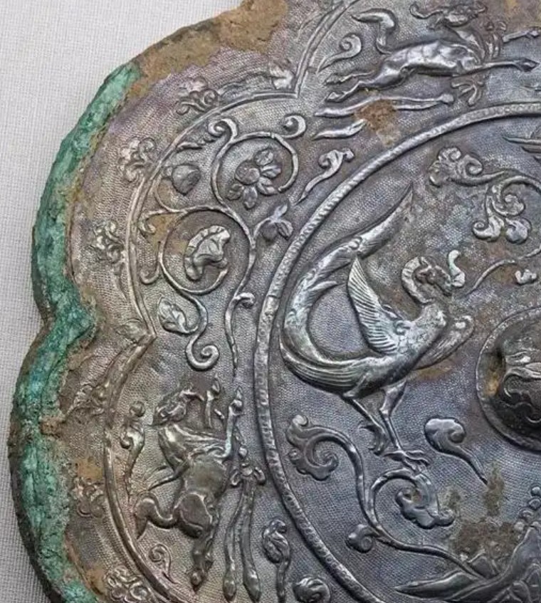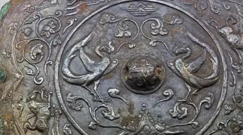 双狮逐兔题材受波斯萨珊王朝猎狮纹影响,葵花瓣造型融合粟特金银器范式,缠枝牡丹中的卷须涡纹与西安何家村窖藏“鎏金舞马衔杯银壶”同源。鸾鸟为婚姻和谐之神(《山海经》西王母信使),狮表权力,兔喻月宫永生,天马通神,双鸾走兽八花镜的学术争议,本质是唐代社会多重信仰交织的微观投射——佛教莲华与楚地芙蓉共生,鸾凤祥瑞包裹着生死哲思,西域金工催生却扎根于中原范铸。