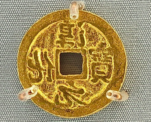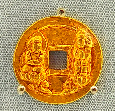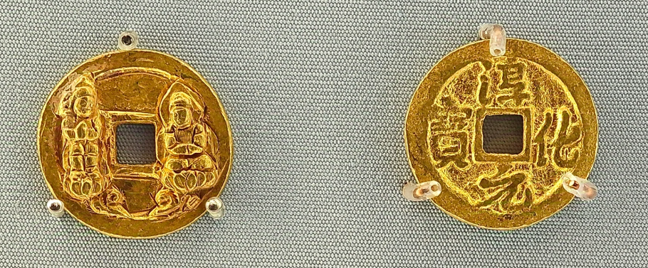 该金钱直径2.4厘米,重12克,含金量96%,正面旋读“淳化元宝”楷书四字(宋太宗御笔),背面浮雕两尊飞天:左侧飞天持莲花,右侧托宝盘,衣带飘逸,云纹衬底,铸造精度达0.1毫米,体现宋代翻砂铸币工艺巅峰