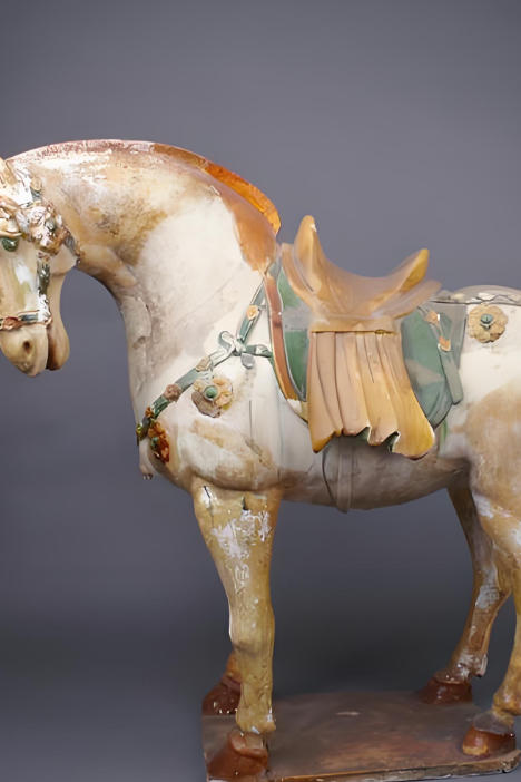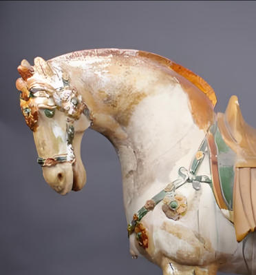 三彩马俑,造型雄伟,栩栩如生, 完美呈现了唐代骏马的矫健身姿与威武神韵。其精湛的制瓷工艺与独特的艺术风格,充分展现了唐代瓷器制作的卓越成就。同时,如此大型且保存完好的三彩马,实属罕见,更难得的是还保留着原配的“火珠”。