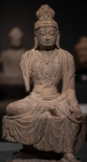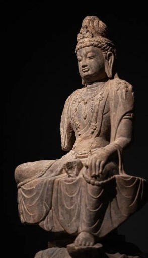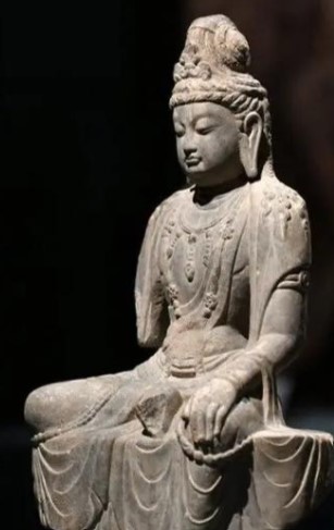 隋代统一后(581年),文帝复兴佛教,曲阳成为北方白石造像中心。半跏思惟像源自印度犍陀罗艺术,隋代融合南朝"秀骨清像"与北齐"薄衣贴体"风格,此像即反映开皇年间佛教艺术本土化转型