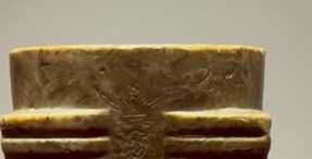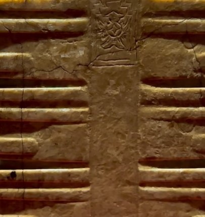 2. 纹饰特征:每节四角饰简化神人兽面纹(“神徽”),神人面以阴刻线勾勒双眼与阔嘴,兽面以两个凸起的椭圆形眼球为核心,周围刻细密回纹,纹饰仅存轮廓,体现晚期简化特征;