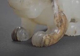 3. 工艺细节:采用圆雕与浮雕结合,虎身线条流畅,转折处圆润,腹部有穿系孔(用于佩戴),沁色集中于腹部与足部,呈自然褐色;