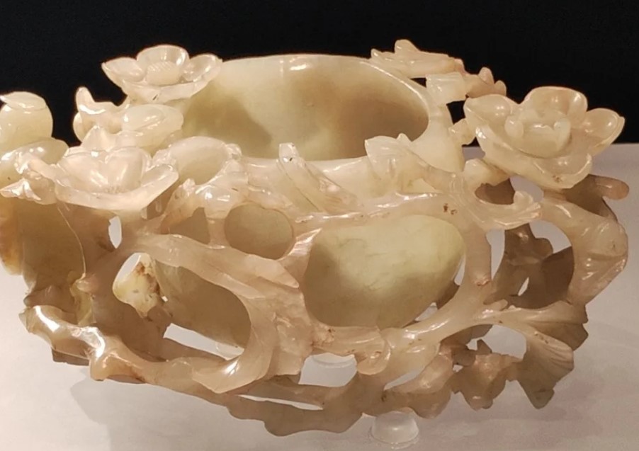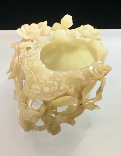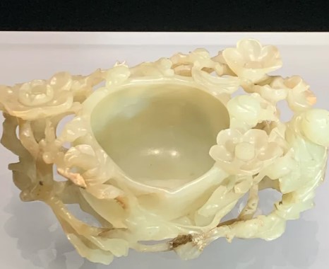 3. 工艺细节:玉质洁白细腻,杯口与圈足打磨光滑,螭龙与杯身采用 “镂雕” 技法一体成型,接缝隐蔽,内壁平整,底部有细小款识(模糊不清);