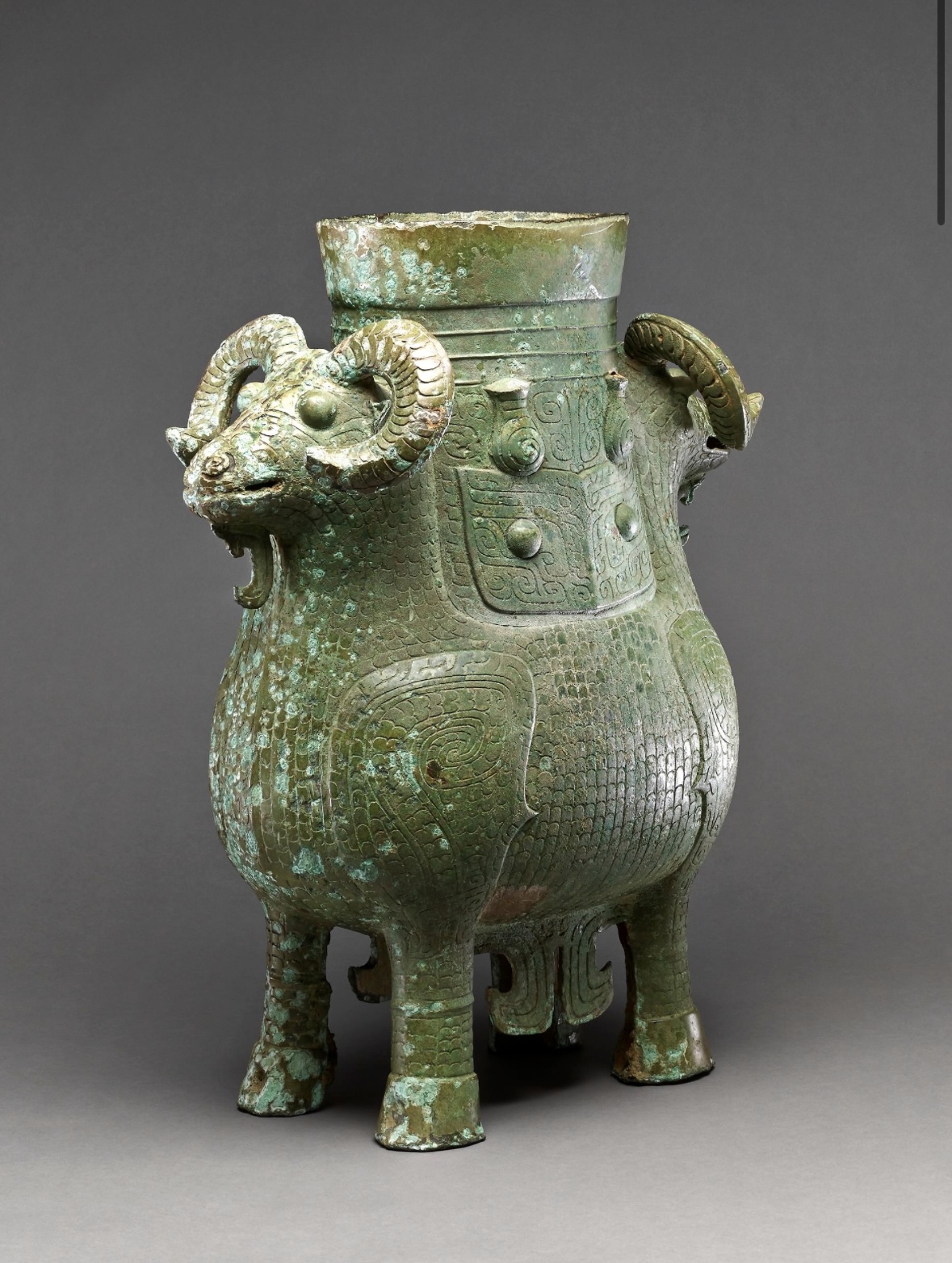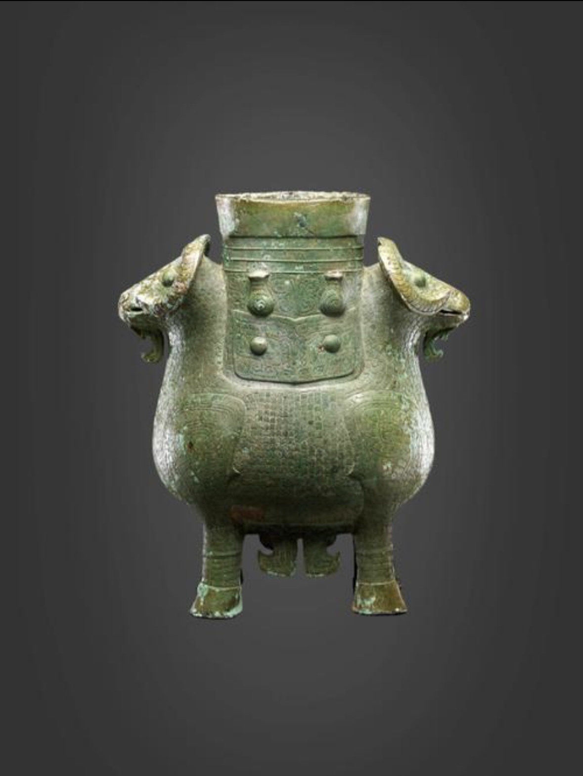 羊角与羊首的造型体现了先秦时期“吉羊即吉祥”的文化观念,双羊共用四足形成稳定结构,既体现写实性又蕴含对称美学。其纹饰中的饕餮纹象征威严,鳞纹暗示水火元素,反映了商代青铜铸造工艺的高超水平。
