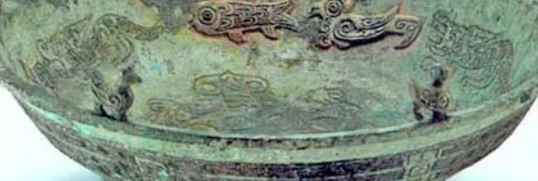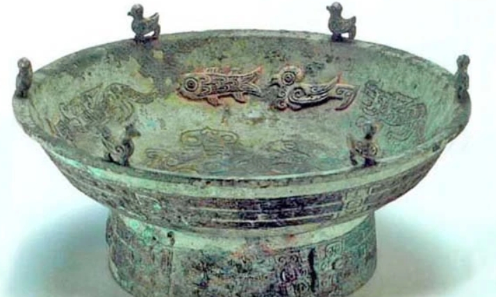 传河南安阳出土,沿上铸6只小鸟,浅腹圈足,圈外壁饰目纹,圈足饰兽面纹,盘内中央饰龟纹,盘壁饰三组动物纹,每组长浮雕鱼、鸟、用线刻度。龟两侧各铭文一字。