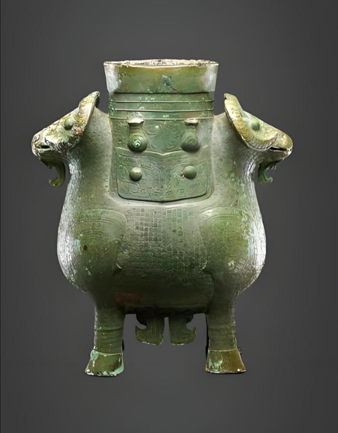 青铜双羊尊作为商代晚期(约公元前13-11世纪)典型青铜礼器,其历史背景深刻反映了晚商时期的社会文化与技术发展。该器可能铸造于殷墟文化时期,当时青铜铸造技术达到顶峰,动物造型礼器盛行,羊图腾被赋予"吉祥"寓意,常见于祭祀场景。