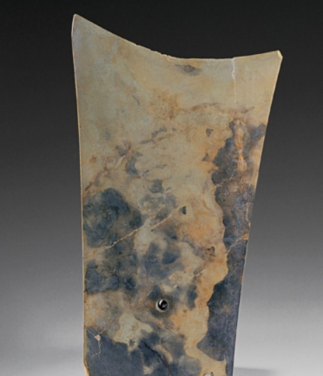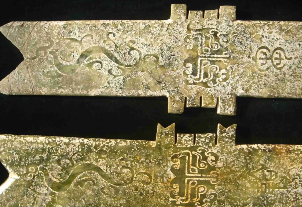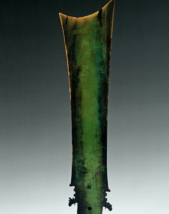长25厘米,宽7.11厘米,0.64厘米。1986年于四川广汉三星堆遗址一号祭祀坑出土,栗黄色,一侧经火烧呈鸡骨白色。射前端薄而宽,后端厚而窄,两面扁平,射端刃口呈凹弧形。后端两侧有齿饰,与两面齿饰对应处留有起稿齿饰的平行阴线。 长方邸,邸前正中有一圆穿。