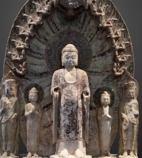 2. 菩萨细节:胁侍菩萨头戴宝冠,冠缯垂至肩部,面相清秀,嘴角带亲切微笑,双目微睁,神态温和;身躯略呈 “S” 形扭动,体现北齐菩萨像的灵动特质;