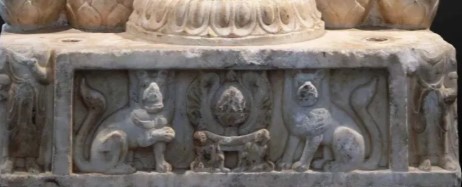 3. 附属元素:台座中央为博山形香炉,两侧各蹲踞一狮,边缘立有供养人(头部已佚失);背屏上部雕刻十二身飞天,两两相对,顶部为翔龙托塔图案,背光处有阴线刻出的光芒线;