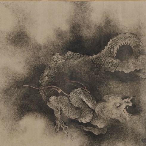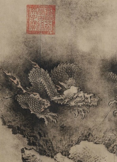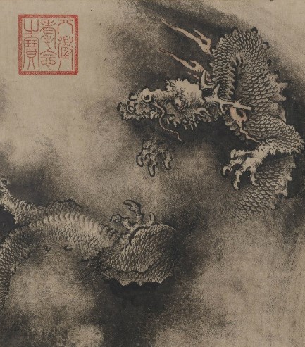 第二龙,仅露头尾,与缭绕的雾气相容,双目斜视,回眸望向第一龙。