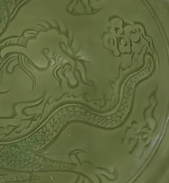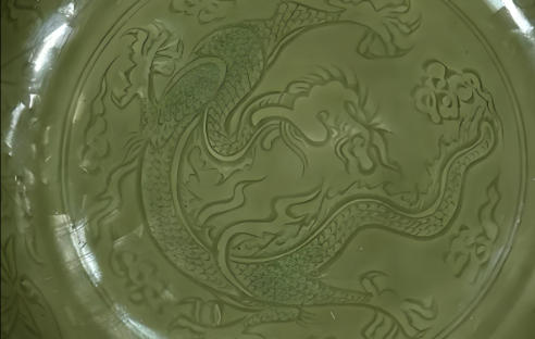 设计独特,折沿口、弧形腹、平底内敛圈足,足端露胎,胎质坚实。盘内底部饰有四爪龙纹,栩栩如生,内壁刻有海水波涛纹,与龙纹相得益彰。器身内外施青釉,色泽清亮如春水,静谧深邃。此盘不仅是元代瓷器工艺的杰出代表,更以其精湛的艺术表现力,见证了历史的沧桑与韵味,是一件兼具艺术价值与历史意义的珍贵文物。