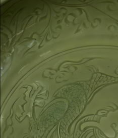 元代龙泉窑青釉龙纹盘是14世纪中国制瓷工艺的杰出代表,其历史背景与蒙元时期海上贸易扩张及宫廷用瓷制度密切相关。该盘采用模印贴花技法装饰四爪龙纹,符合元代"五爪为御用,四爪赐藩王"的礼制规范,常见于赏赐高丽、琉球等藩属国的外交场合。其大尺寸折沿造型适应游牧民族分食习俗,而釉下龙纹与海水纹的组合既延续宋代龙泉刻花传统,又融入蒙古贵族喜好的立体装饰风格。