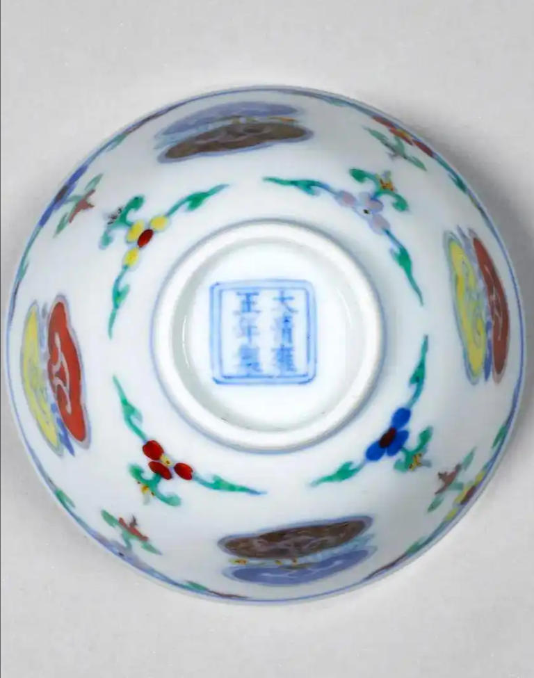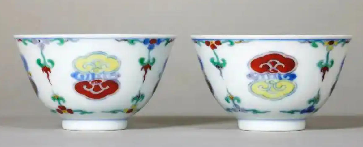 清雍正斗彩灵芝纹杯高4.3厘米,口径7.3厘米,造型秀雅端庄。杯身外壁以斗彩工艺绘四组团状灵芝纹,间饰花草纹样,釉下青花勾勒轮廓,釉上填绘红、绿、黄、紫诸彩,色彩明丽莹润。胎质坚薄细腻,白釉清透温润,底部落"大清雍正年制"六字双行楷书款。其纹饰疏朗有致,绘制精妙流畅,既承袭成化斗彩遗韵,又展现雍正朝瓷器特有的清雅风骨,成对传世尤为珍贵,堪称雍正御窑仿古创新的典范之作。