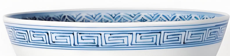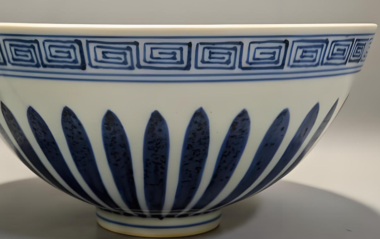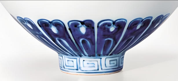 这件青花鸡心碗,口径14.4公分,高11公分,腹部绘有莲瓣纹,碗口下部则绘有回形纹。胎质洁白细腻,釉面白中泛青,如冰似玉,显得格外雅致。青花图案使用进口的苏麻离青料绘制,发色艳丽,铁锈斑深入胎骨,显微照片中的铁锈斑和结晶斑显示,这件鸡心碗应该是永乐早期的制品。