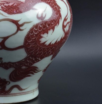 造型特征:釉里红大罐多为短颈丰肩、鼓腹渐收底、广底矮圈足的造型。例如,元釉里红龙纹大罐高30厘米,短颈丰肩,鼓腹渐收底,广底矮圈足沾釉,见旋纹,底足中间有支钉痕。