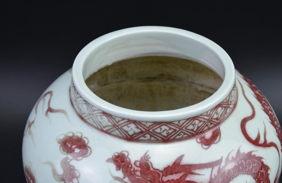 多元文化交融:元代作为少数民族建立的政权,其陶瓷艺术体现了多元文化交融的特点。釉里红大罐上的龙纹、莲纹等纹饰,既保留了中原文化的传统元素,又融入了草原民族的豪迈气魄和波斯艺术的曲线美感。