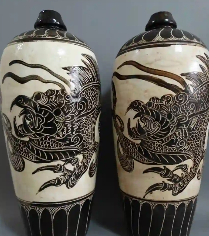 该造型的北宋白釉黑剔花龙纹瓶,小口宽肩,肩部浑圆饱满,线条流畅,造型敦厚大气。它的装饰特征鲜明,一只腾龙飞跃而下,头、尾、爪布满瓶体,龙头收缩入肩,肩胸部构成主体,展示一种蓄势待发的动态。两只前爪,一扬一收,也构成动势,爪尖锋利,充满力量感。飘动的须和脊翅增加了龙的威猛气势。纹样剔划得非常细腻,片片龙鳞清晰而有秩序,平添一种工艺的精细感。整个图案刻画出了叱咤风云的腾龙形象,表现了陶工精湛的造型能力和表现力。