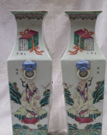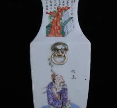 器呈四方形,撇口、束颈、折肩、直腹微敛,通体施素白釉,口饰金彩,颈部饰粉彩开光诗文,肩部饰红彩双狮耳,腹部绘粉彩无双谱人物图,配墨彩诗文,绘画细緻,色彩艳丽,形制古拙,胎体坚密厚重。