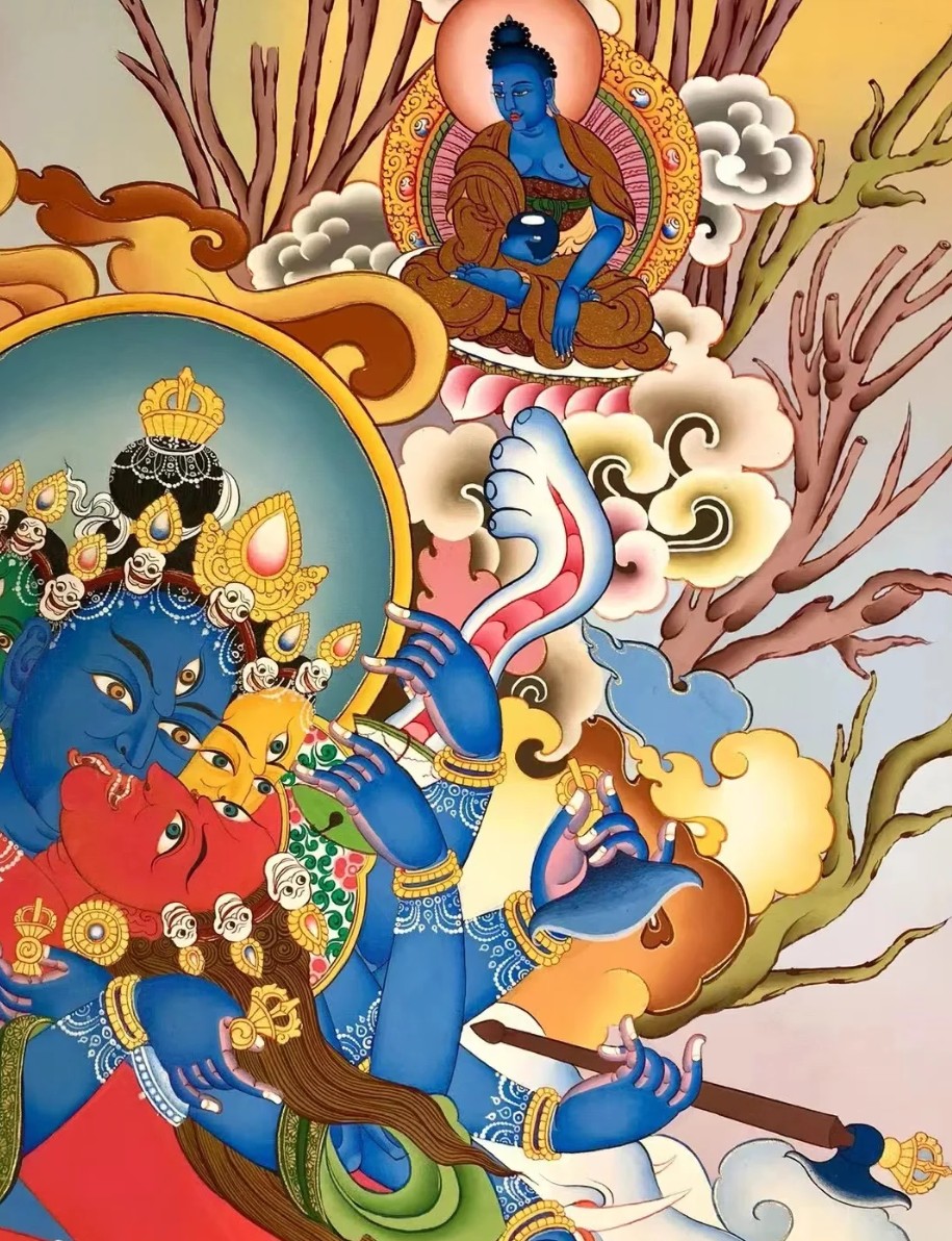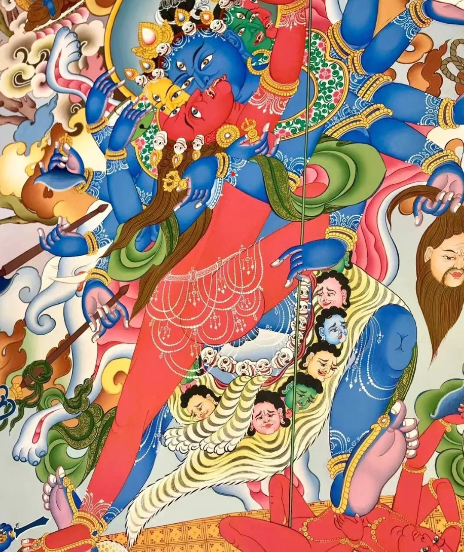 主尊深蓝身四面十二臂,怒目三目象征洞穿三世,头戴五骷髅冠表无常;左拥朱红金刚亥母,手持金刚杵,右展立踏伏魔男女。十二臂分执法器:左持象皮、颅器、绢索,右执斧戟、钺刀、骨鼓,周身饰人头璎珞与虎皮裙。背景以金线绣六臂大黑天及黄教祖师,绢底彩绣层叠,火焰纹背光灼灼如生,尽显密宗“悲智双运”的哲学意象