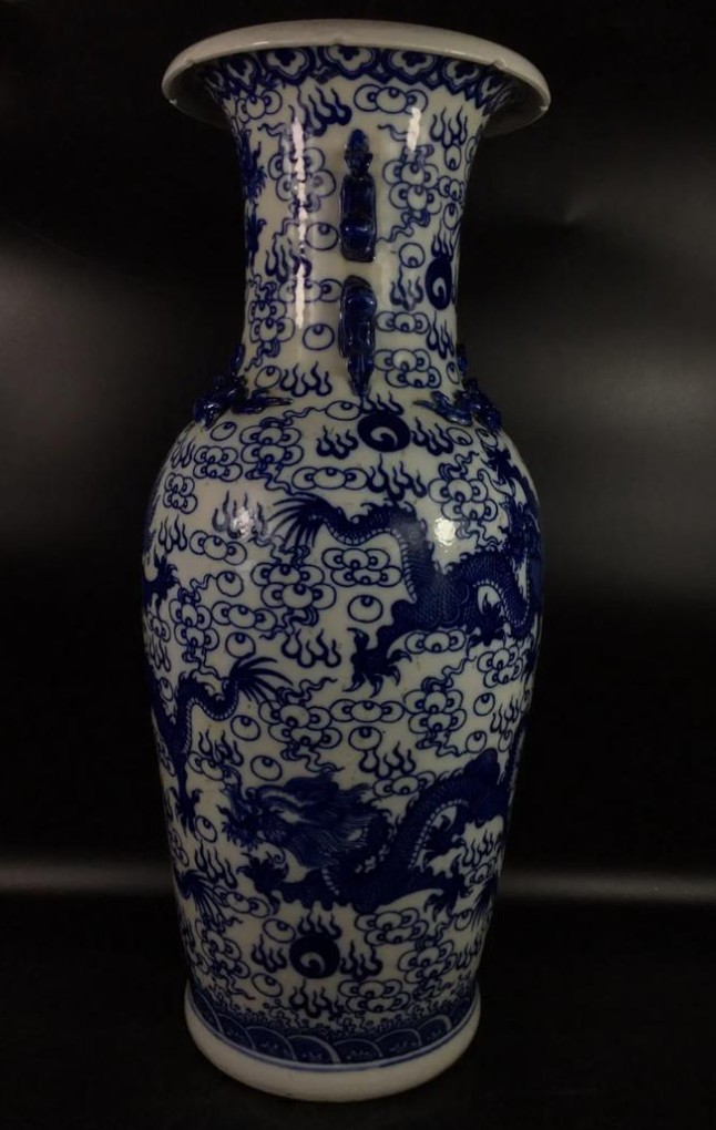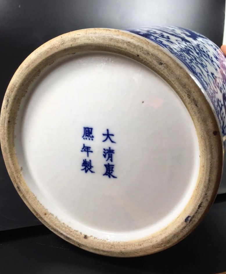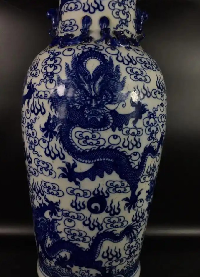 康熙时期龙纹瓷器象征皇权威严,龙形凶猛矫健,反映清初国力强盛与帝王尚武精神。此瓶为景德镇御窑厂烧造,青花使用国产浙料,发色被誉为“翠毛蓝”,工艺上承明代技法而更趋精细,是中外文化交流的见证,部分同类器曾通过海上贸易流入欧洲