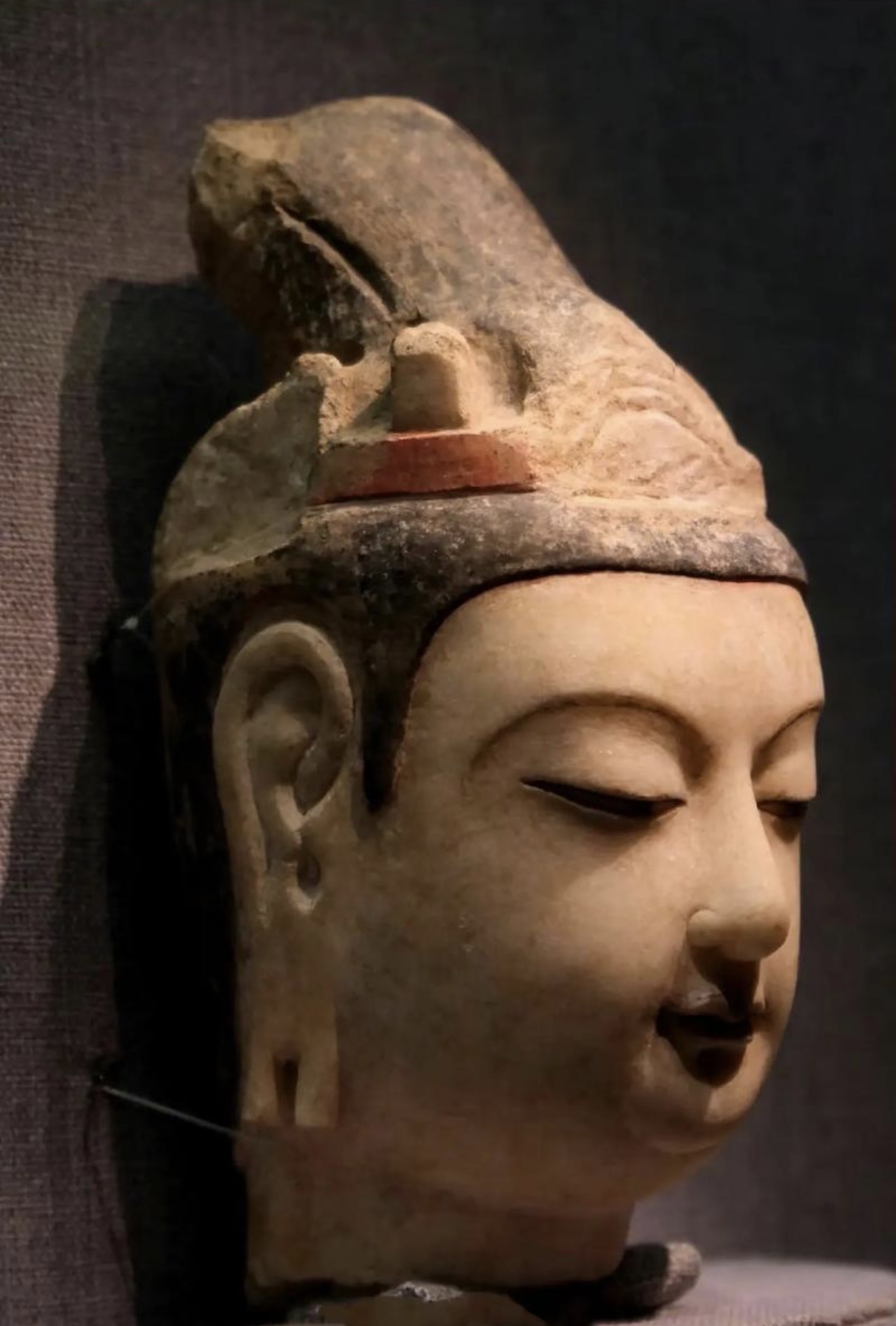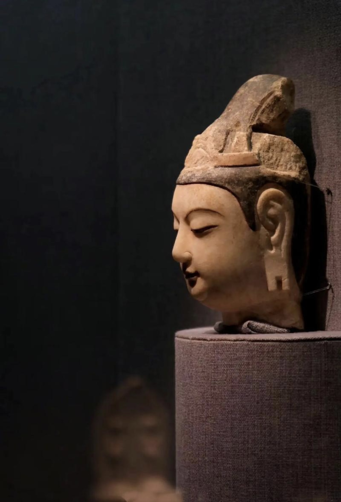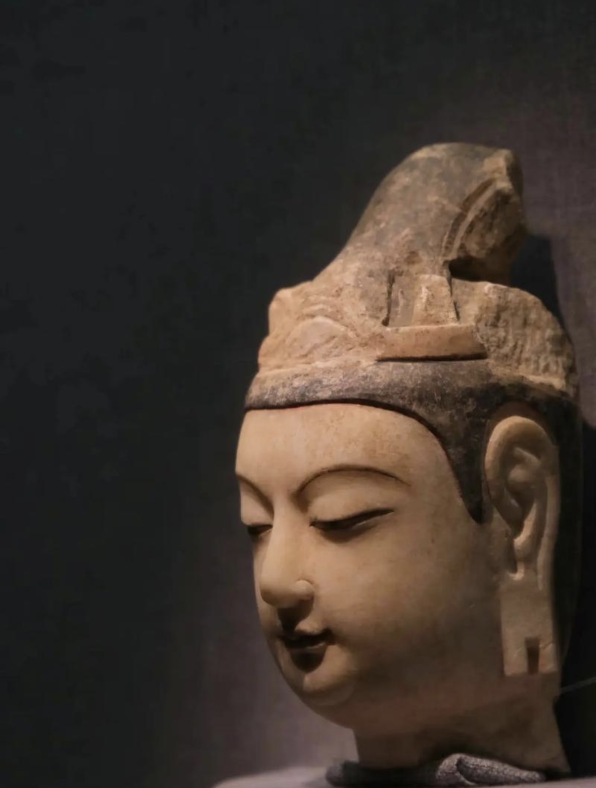 佛教在北齐时期(550-577年)得到统治者推崇,观音形象多以女性化呈现,强调慈悲与救赎主题。雕像的面部特征反映了中西艺术融合:既有印度“秀骨清像”的清瘦感,又保留了中国本土圆润的审美倾向。