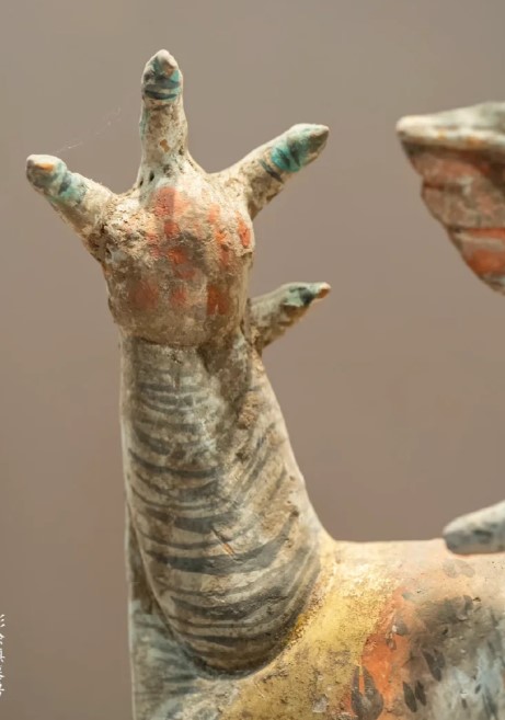 3. 细节:颈部或背部有穿孔(可能用于插置兵器或装饰),底部有方形底座,表面彩绘以红色勾勒轮廓,绿色、黄色填充毛发与羽翼,面部以白色打底,墨色点睛;