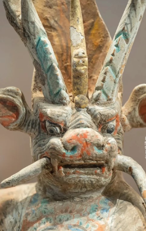 2. 造型:头部多为兽面(狮面或牛面),头顶生角(单角或双角,角呈螺旋状或火焰状),双目圆睁,獠牙外露,面部表情狰狞;身体似人形,上身前倾,四肢粗壮,部分有翼(羽翼或兽翼),背部可能饰有鬃毛或火焰纹;