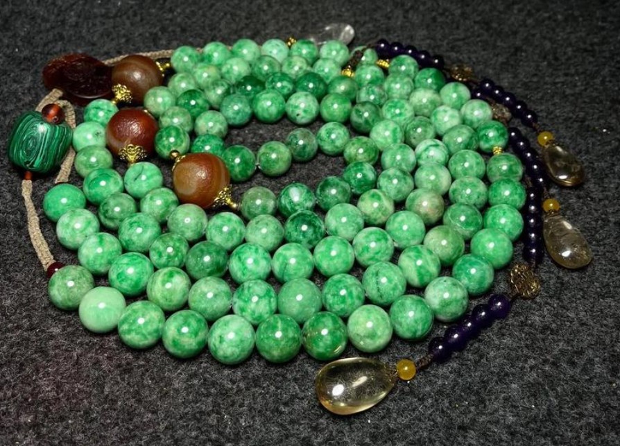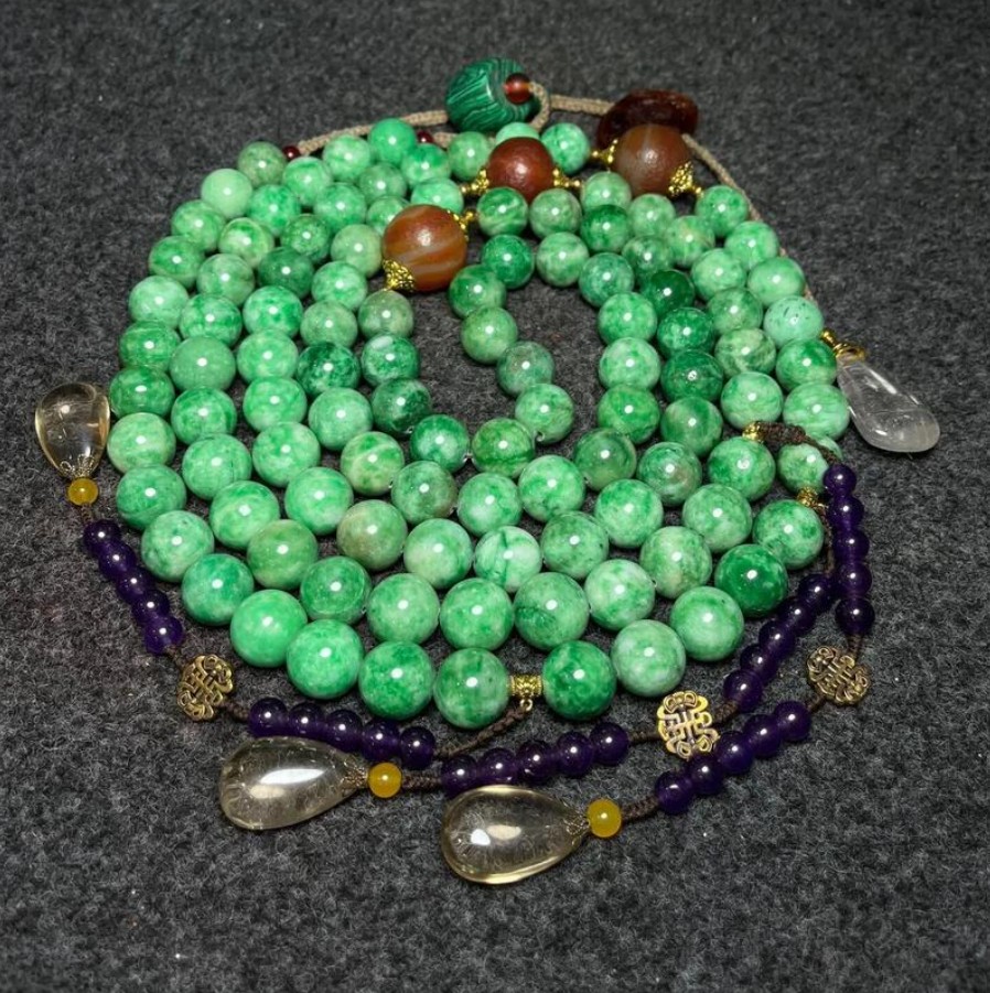 典型翡翠朝珠由108颗老坑种翠珠组成,珠径12-15毫米,色呈帝王绿或阳绿,间以4颗红珊瑚佛头分隔,象征四季。北京故宫藏朝珠(清宫旧藏)配金累丝嵌宝石背云,下垂翡翠坠角,三串记念以碧玺小珠串成,丝绦为明黄色,整体莹润如凝脂,透光可见纤维交织结构