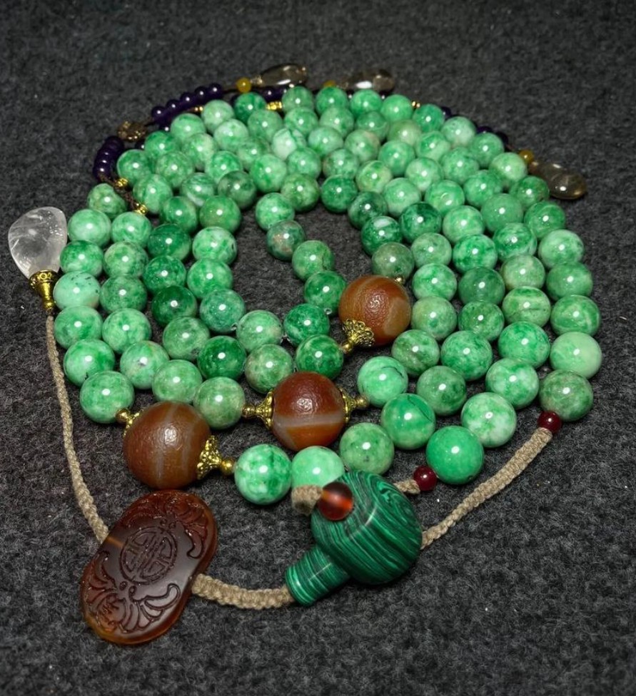 翡翠朝珠在清代是皇权与佛教融合的产物。乾隆时期确立其典章制度,规定祭祀、朝会需按“天青地黄芋日红月白”四色搭配材质,东珠朝珠仅限帝后使用。晚清慈禧太后痴迷翡翠,推动其从礼器转为奢侈品,京造办处档案记载其拥有逾30盘翡翠朝珠,原料多来自缅甸雾露河矿区。民国后,宫廷翡翠通过溥仪变卖和文物走私大规模流失,现存完整器多见于北京故宫、台北故宫及欧美博物馆
