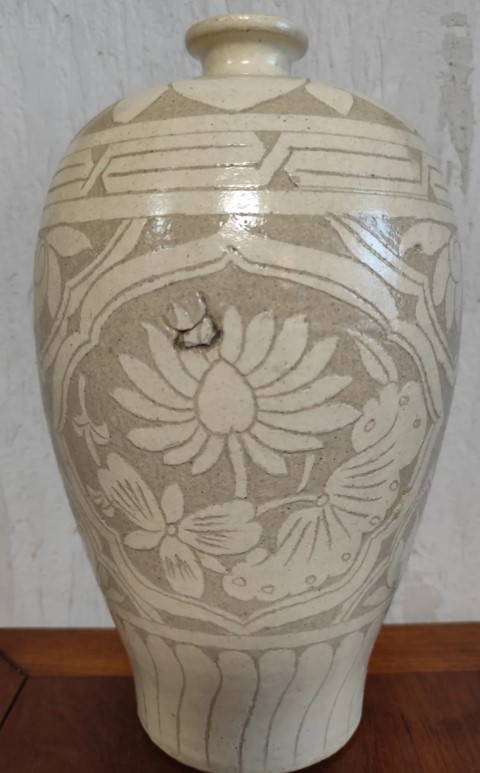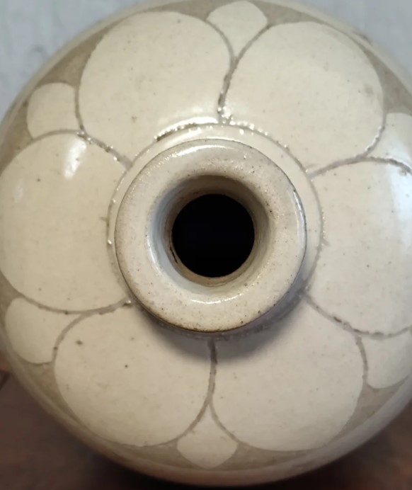 宋代商品经济繁荣,市民阶层崛起,对日用瓷器的需求激增。磁州窑作为北方最大的民间窑系,以 “白釉黑彩” 为特色,不追求名贵釉色(如青瓷、白瓷),而是通过绘画装饰赋予瓷器生命力,形成 “民窑” 独特风格。此件梅瓶与河北磁县观台窑、河南鹤壁窑出土的宋代磁州窑器物风格一致,印证了磁州窑 “跨地域生产” 的特点。宋代 “禁酒” 政策松动,酒类消费旺盛,梅瓶作为酒器广泛流行,其纹饰中的 “酒” 字与花卉,正是市民生活 “饮酒赏景” 的真实写照 —— 这与宋代城市 “瓦舍勾栏” 的娱乐文化、文人 “浅斟低唱” 的风尚相互呼应,展现了宋代社会多元的生活图景。