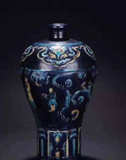 梅瓶修长挺拔(高约30-40cm),肩部丰满,腹部渐收。采用"立粉堆花"技法:以胎泥勾勒缠枝牡丹、八仙等纹饰轮廓,再填施孔雀蓝、茄皮紫、鹅黄等低温釉,釉色明艳如宝石。胎骨灰白疏松,底足露胎处可见明显旋坯痕。