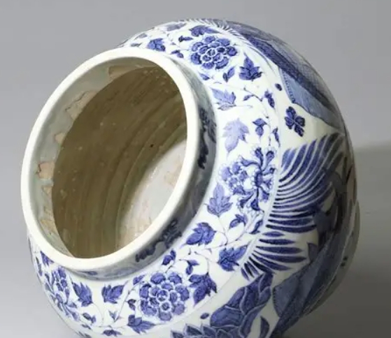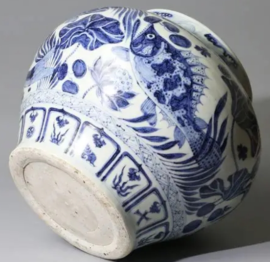 元代青花鱼藻纹寓意"富贵有余",融合汉地绘画传统与伊斯兰审美。此罐与土耳其托普卡帕宫藏同类器如出一辙,证实为14世纪景德镇外销瓷精品。明代《格古要论》特别记载"元朝烧小足印花者,内有'枢府'字者高"。