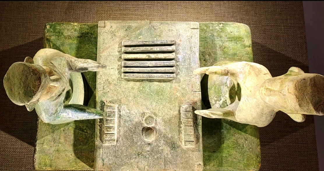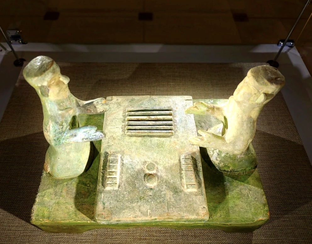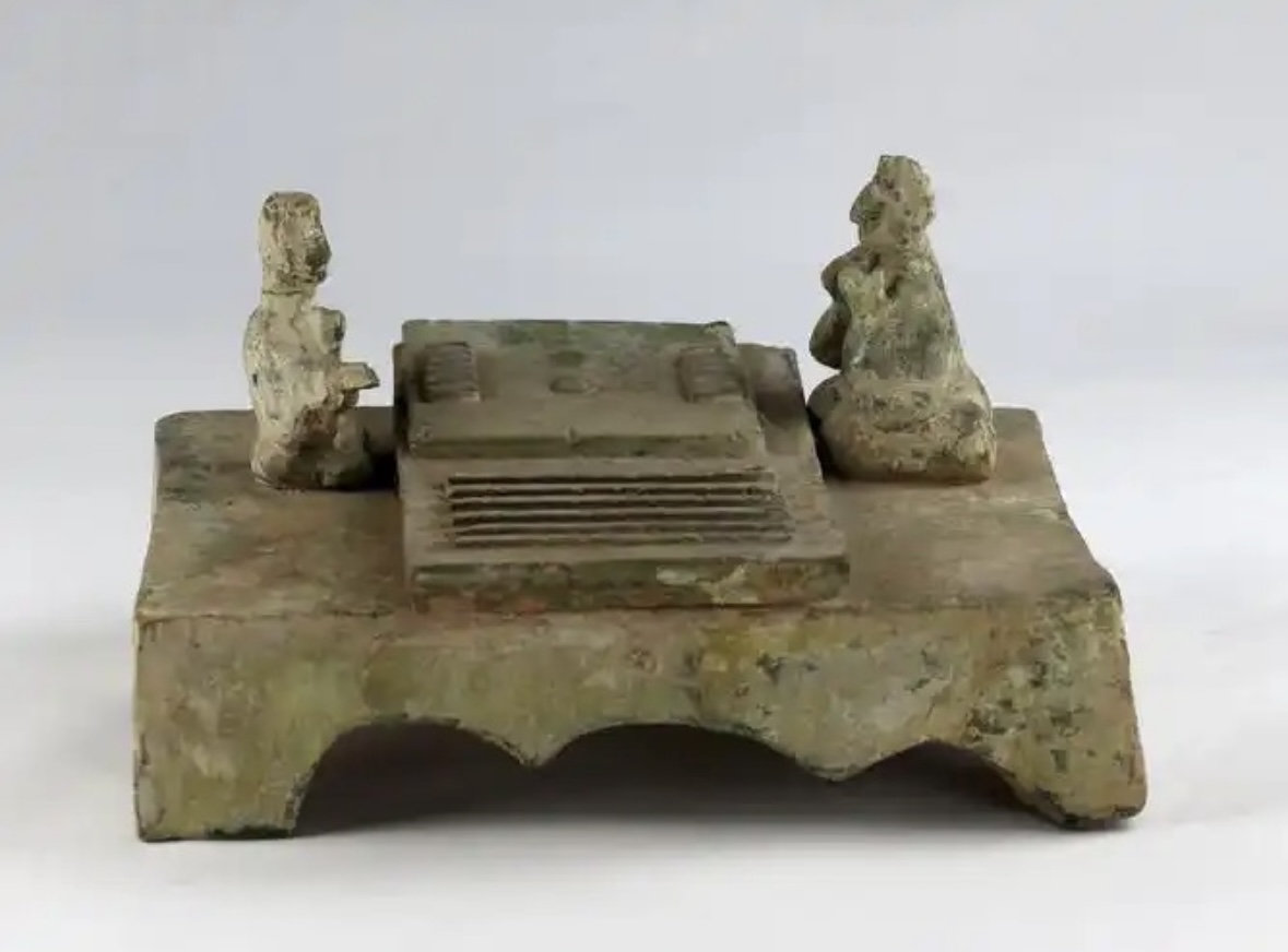 东汉绿釉陶六博俑由绿釉陶质制成,包含长方形合榻、对坐的两个人物俑、博枰及博具。两人跽坐对弈,姿态生动,博枰两侧分别放置六根箸和方形棋盘,棋盘两边各有六枚棋子,中间有圆“鱼”作为标记。
