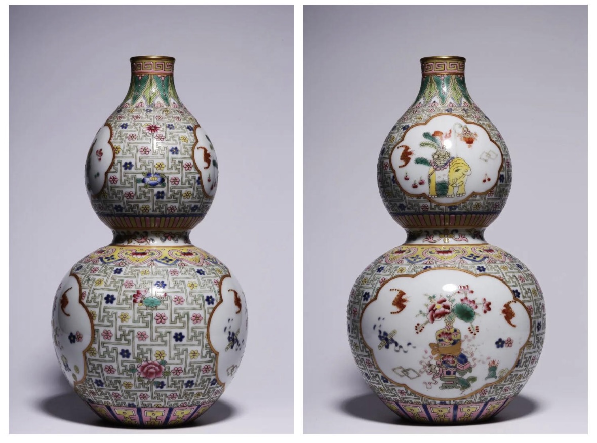 葫芦瓶主体由上下球状腹体通过束腰连接,造型规整。口沿与束腰处饰如意云头纹,中腰绘描金双线及多色回纹。器身主体满绘串枝莲纹,搭配蝙蝠、卍字符、长命锁及寿字图案,腹下部装饰须弥纹,底署“大清乾隆年制”篆书款。