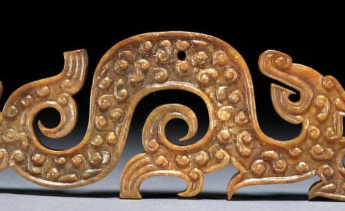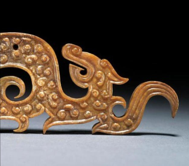 尺寸为5.4×12.7厘米。此玉佩呈双头龙形吊坠,设计精美,两侧浮雕小卷轴,翅膀与尾部线条流畅。玉石微透明,融合黄绿色与褐色,龙背有三个带凹槽的附属物,功能不明。龙的下颚饰以斜纹,龙脊穿孔整齐。玉背褐色半透明,点缀黑色龙斑,整体磨光细腻,略有残损,但仍不失为战国玉器的杰出代表。