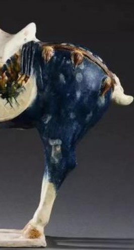 马的文化地位:马在唐代是军事力量、交通出行和贵族生活的象征。唐玄宗曾设“七宝马坊”,养马数万匹,蓝釉马反映了唐代对良马的推崇。