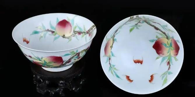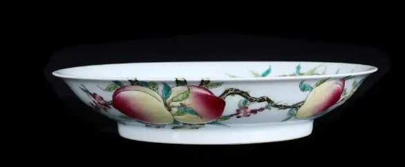 由粉彩玫瑰彩珐琅陶瓷制成的瓷器,生产日期 1723-1735外型尺寸 直径: 8.10英寸。雍正瓷器上桃子的画法,是从桃尖开始,用吸管吹釉,一层层吹,由薄到厚,慢慢渲染,慢慢过渡颜色,由红到粉,再到桃白,再到桃底淡淡的黄绿色,非常自然漂亮,吹釉特有的厚薄不均匀,反而使桃子看上去更加真实。由于制作难度极高,这样的寿桃瓷器在雍正朝的成功率仅在3成左右,成功率极低。