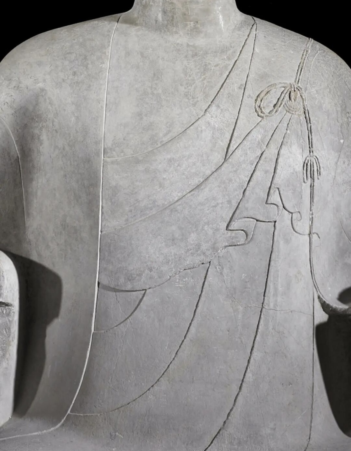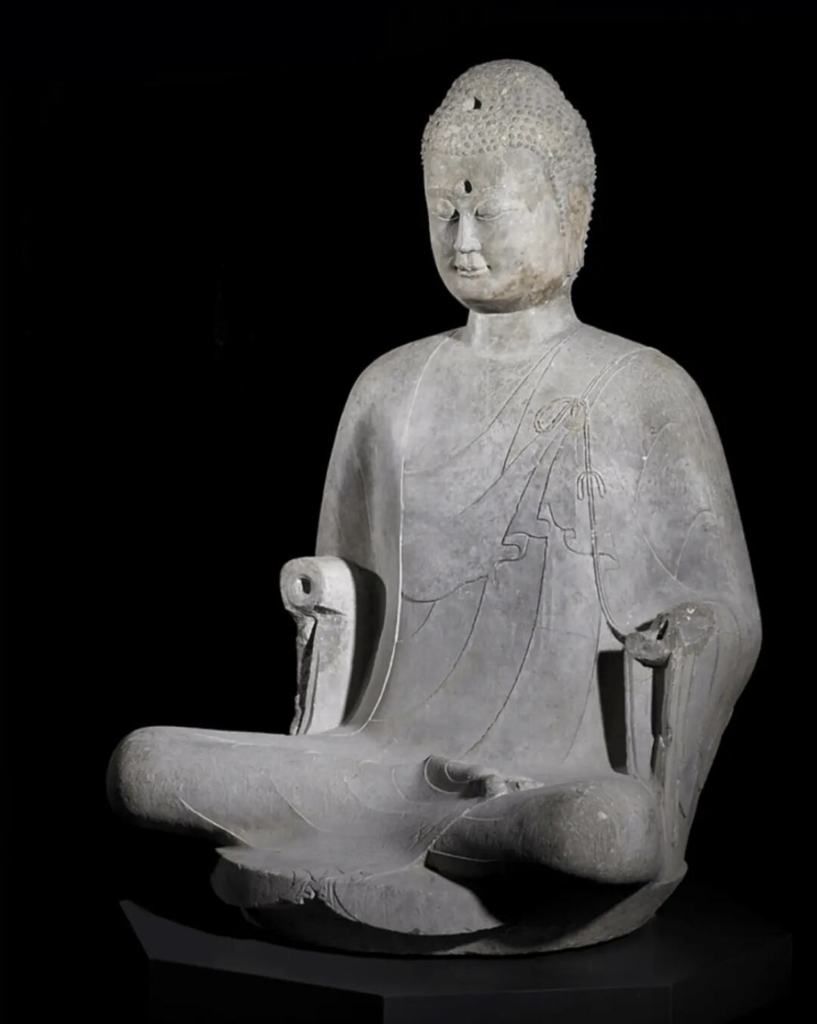 该佛像为弥勒菩萨造型,呈瑜伽禅定坐姿,面相丰圆,双目微闭,手持净瓶与法器,跣足踏莲花宝座。石材表面保留了千年香火熏染的鎏金痕迹,衣纹流畅自然,融合了犍陀罗艺术风格。