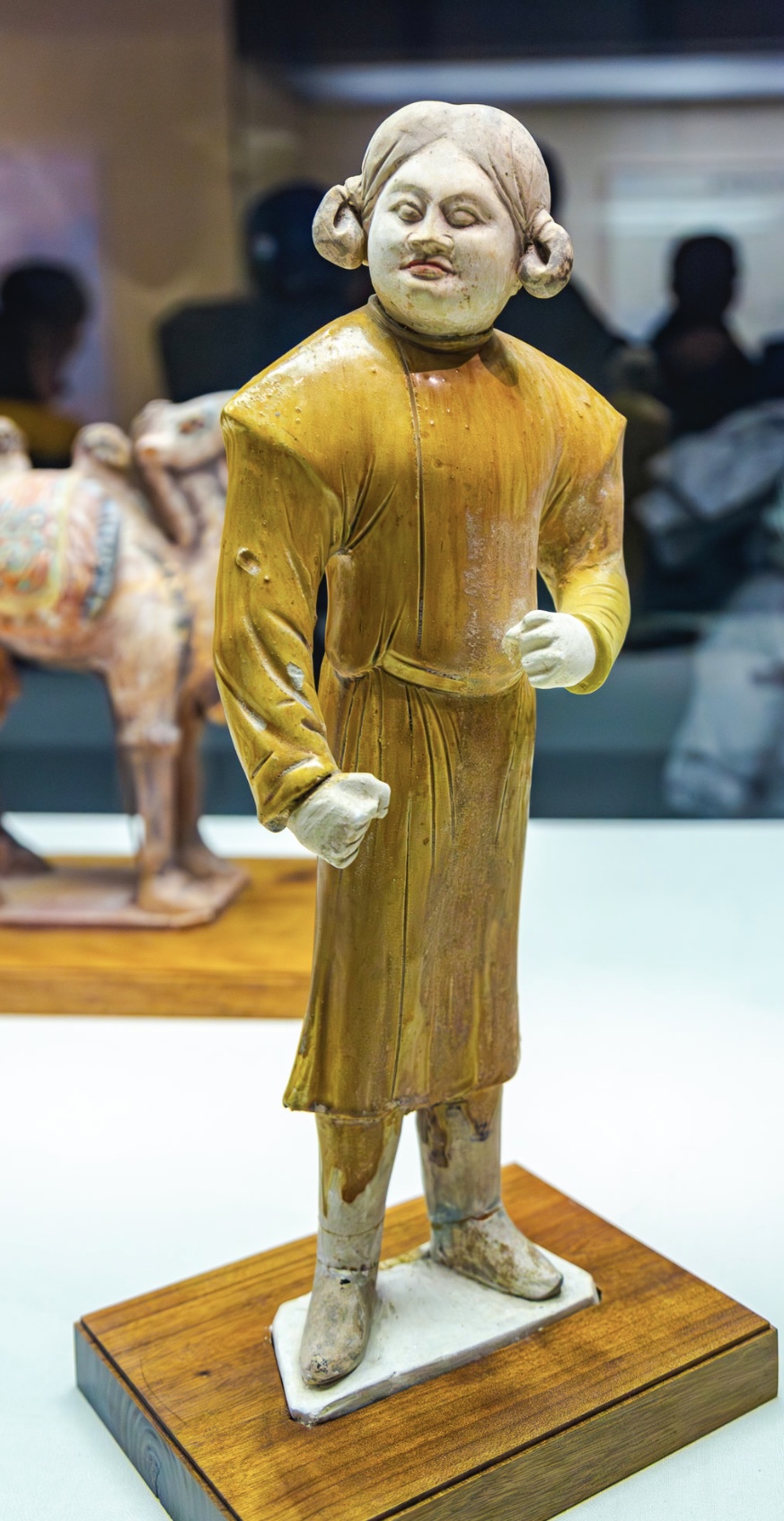 胡人俑通常与骆驼或马组合,展现丝绸之路商旅形象。例如故宫博物院藏黄绿白三彩胡人牵骆驼俑,胡人高68厘米,骆驼高70厘米,驼峰、缰绳等细节刻画写实,底部设长方形托板。