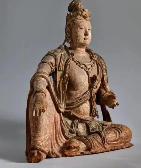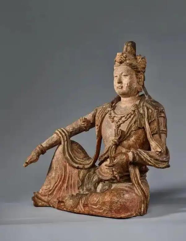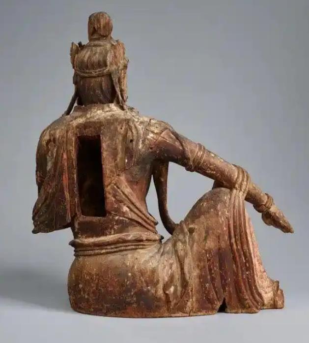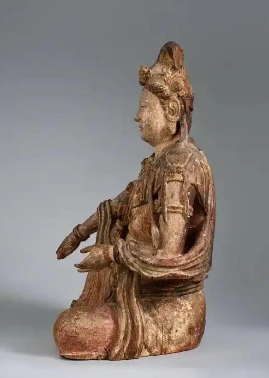 宋代木雕彩绘水月观音坐像高132.1厘米,宽101.6厘米,深63.5厘米,为旧金山亚洲艺术博物馆核心藏品(藏品号B60S24)。造像以桐木雕刻,通体施彩,观音呈半跏趺坐姿(游戏坐),左腿平放,右膝立起,右手搭膝作"与愿印",左手撑地,姿态闲适自然。面相丰腴承唐风,双目垂视,额间白毫相原镶宝石(已佚),颈部三道肉褶延续唐代造像特征。头戴精雕宝冠,璎珞层叠垂落胸前,通肩袈裟衣褶以U形重叠技法表现流水般韵律,帔帛蜿蜒缠绕臂间,末端松散掖于腰际,展现宋代木雕极致写实技艺。其"水中观月"的禅意造型,象征佛法虚空本质,是佛教艺术本土化的典范