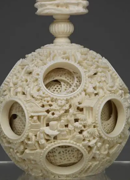 象牙套球最早见于宋代《格古要论》,时称“鬼工球”,仅3层。清代广州牙匠借鉴石狮含珠技法,发展出多层镂雕,乾隆时达14层,清末增至25层,现代最高纪录为62层。因北方气候干燥易裂,此技艺主要在广东传承,尤以翁氏家族(如翁昭)闻名,其24层牙球曾在1915年巴拿马博览会上击败日本赝品获金奖。清宫牙球多由广东进贡,乾隆帝尤为喜爱,甚至禁止妃嫔触碰。晚清时,此类珍品随宫廷衰败流散,部分被蒋介石政权携至台湾,成为两岸文化争议的象征之一。