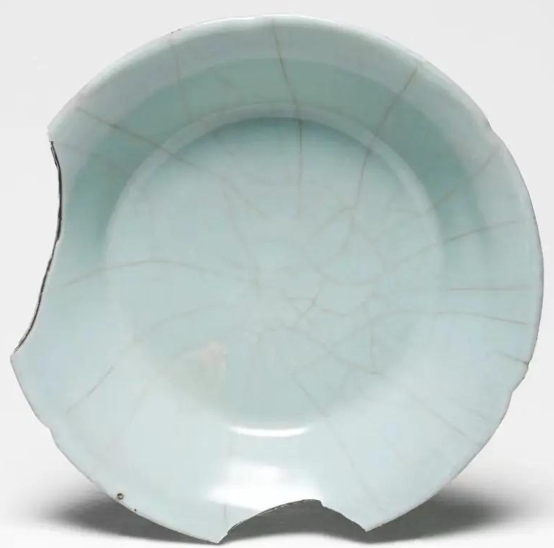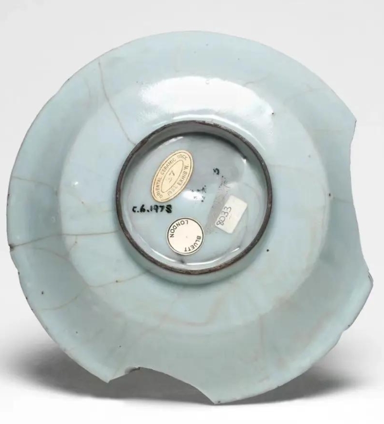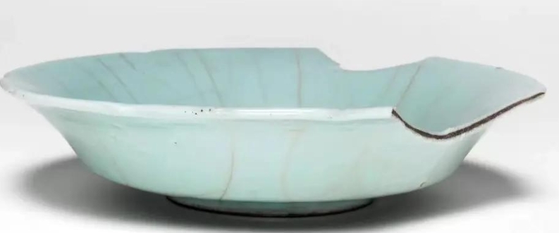 南宋官窑葵口盘一般为六花口折腰盘,口沿呈六瓣葵花形,线条优美流畅,斜壁,盘心微凹,浅腹,整体造型规整、典雅,圈足低矮。葵口盘的尺寸不一,如克利夫兰艺术博物馆藏的南宋至元代葵口盘,直径为 16.5cm,整体厚度 / 高度为 1.125 英寸.采用垫烧法烧制,内外施青釉。