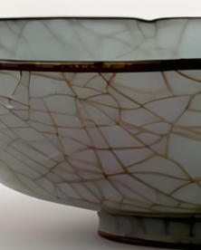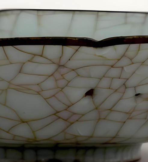 南宋官窑青釉葵口盘,是南宋时期的珍贵瓷器,以其独特的六瓣葵花式造型著称。该盘高5厘米,口径19.5厘米,通体施半透明灰蓝色釉,釉面布满细碎裂纹,口沿镶嵌铜扣,圈足鹿胎色呈棕褐色,底部刻有乾隆时期的题字。此盘现藏于大英博物馆,与另一件粉青釉六瓣葵口盘一同展示了南宋官窑的高超技艺。